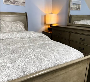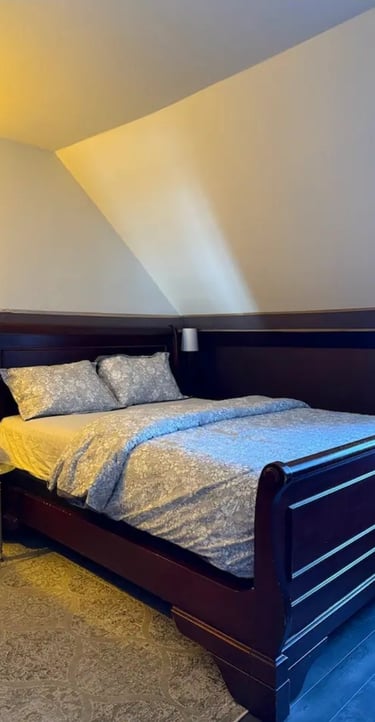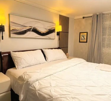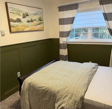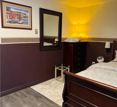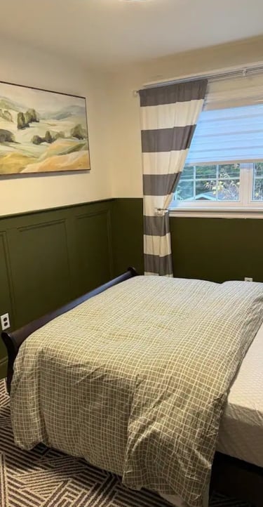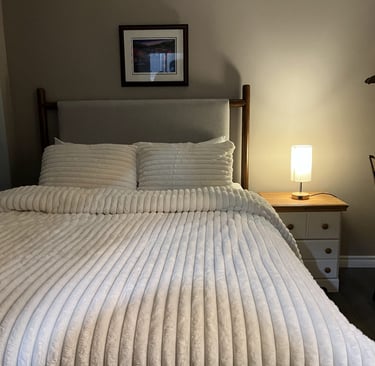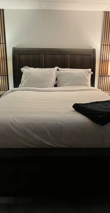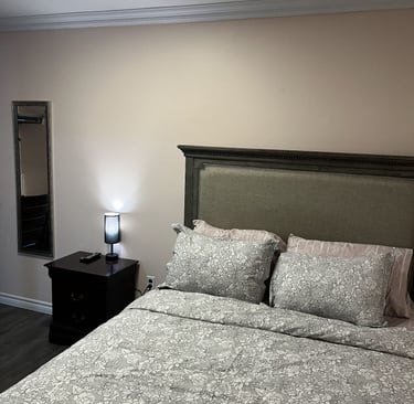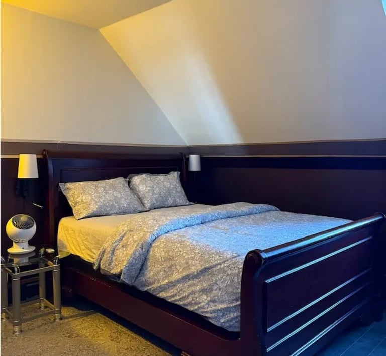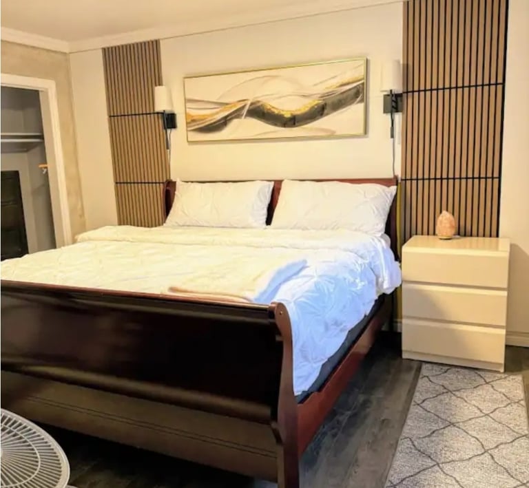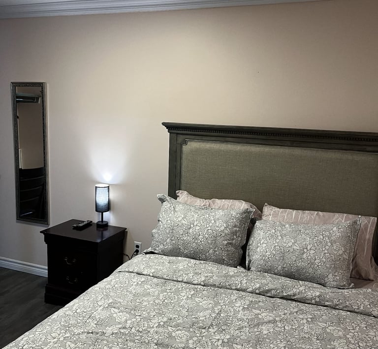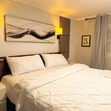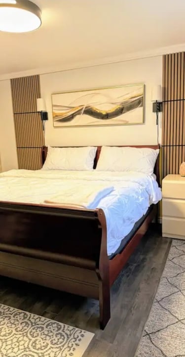 Cozy room with Queen bed, Luxurious spacious atmosphere, bathroom, and sofa.