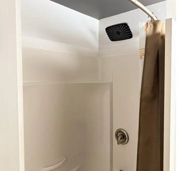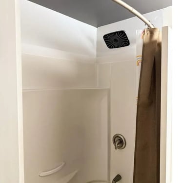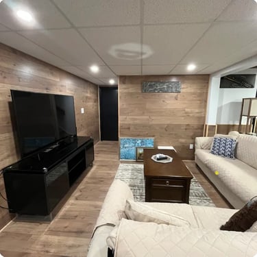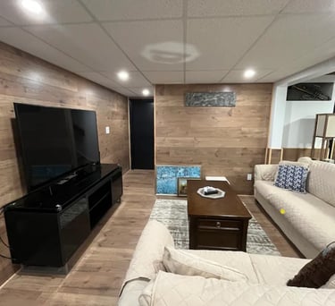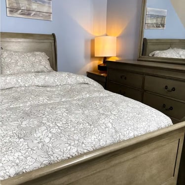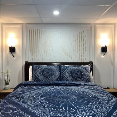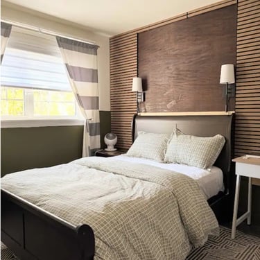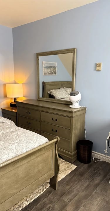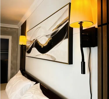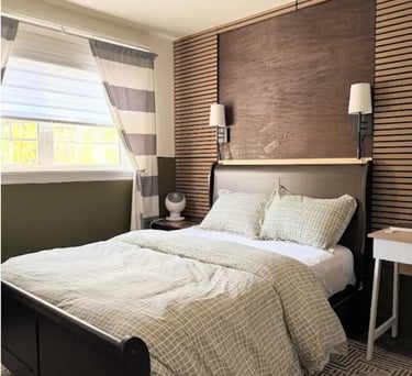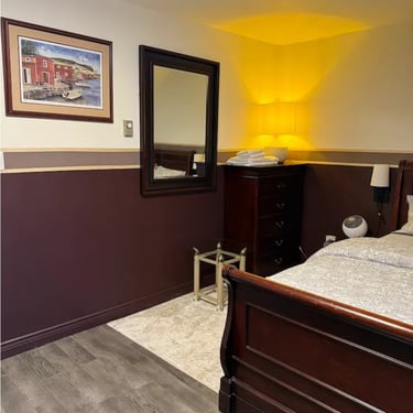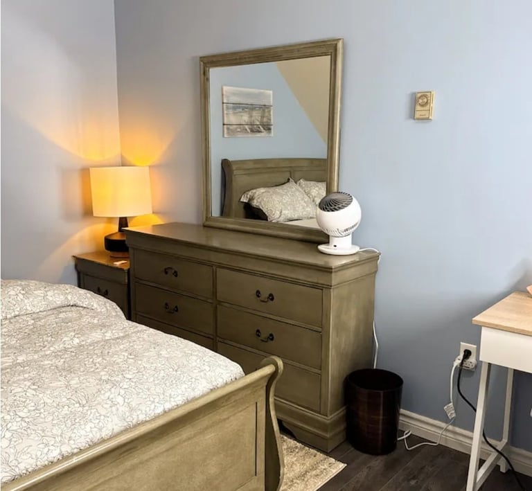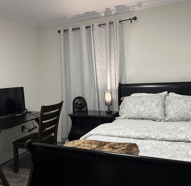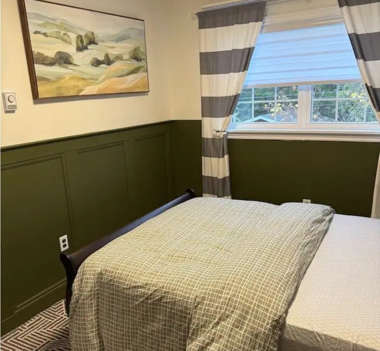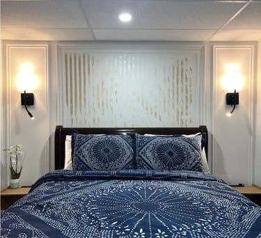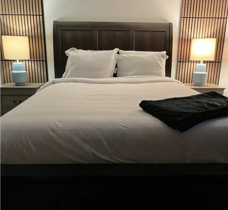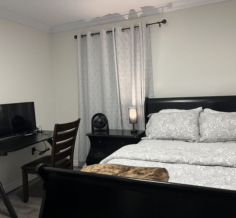 Cozy room with Queen bed, Luxurious spacious atmosphere, bathroom, and sofa.
